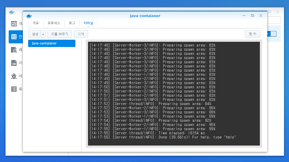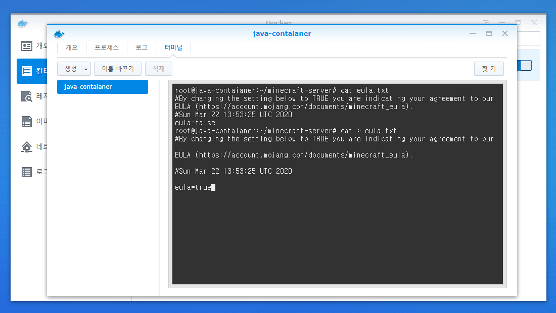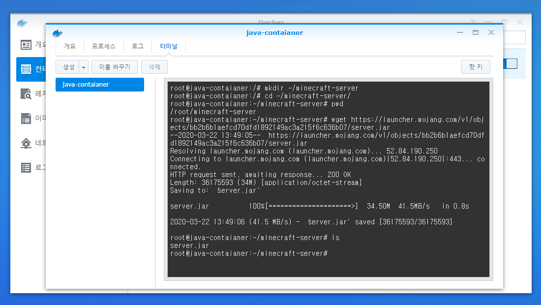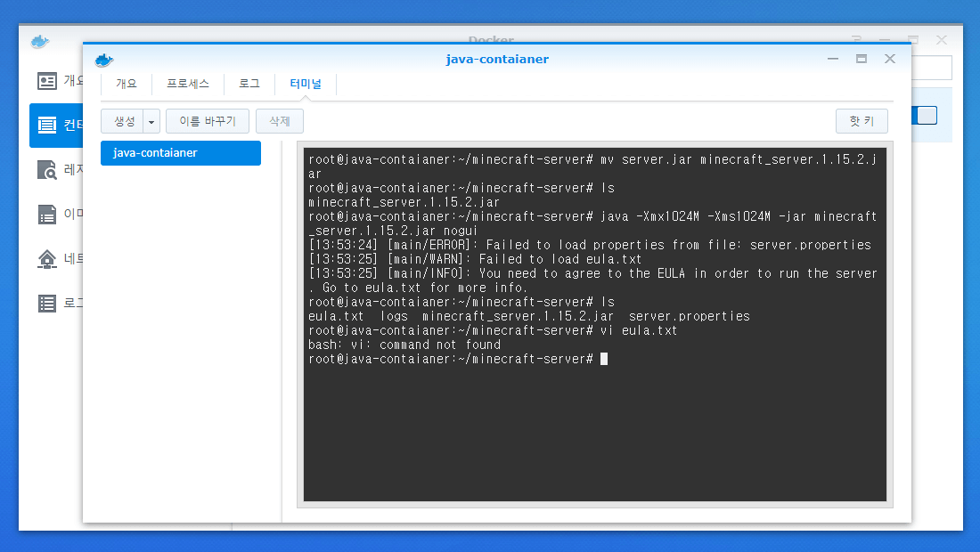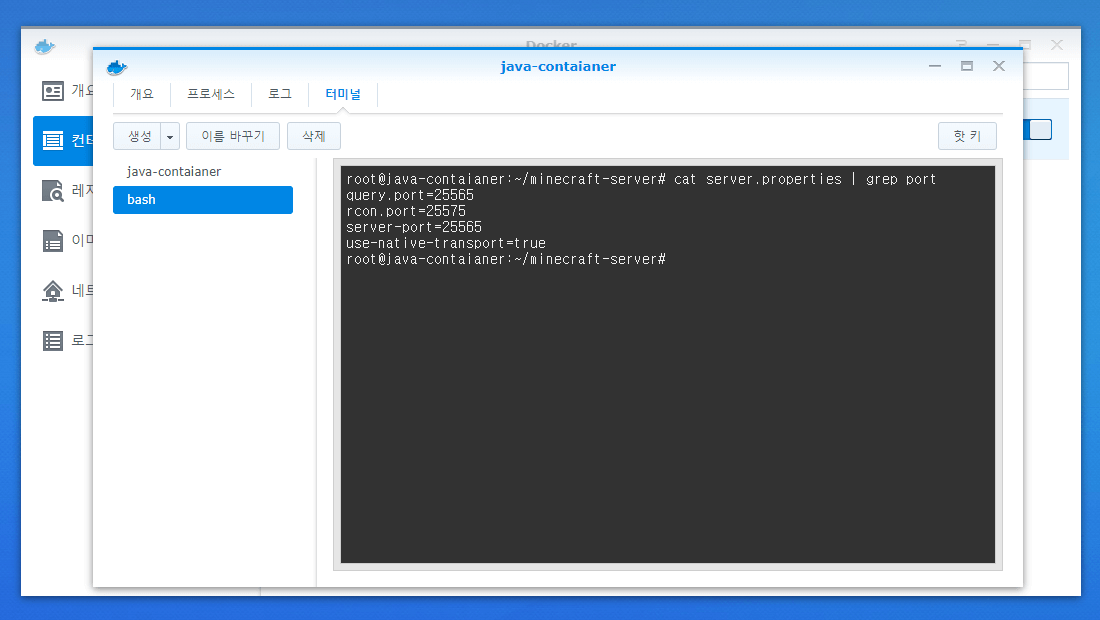 지난 포스팅에서 마인크래프트 서버 구성을 위해 시놀로지 NAS인 DS718+에서 docker를 사용해 java 컨테이너를 실행해서 터미널 화면까지 봤습니다.