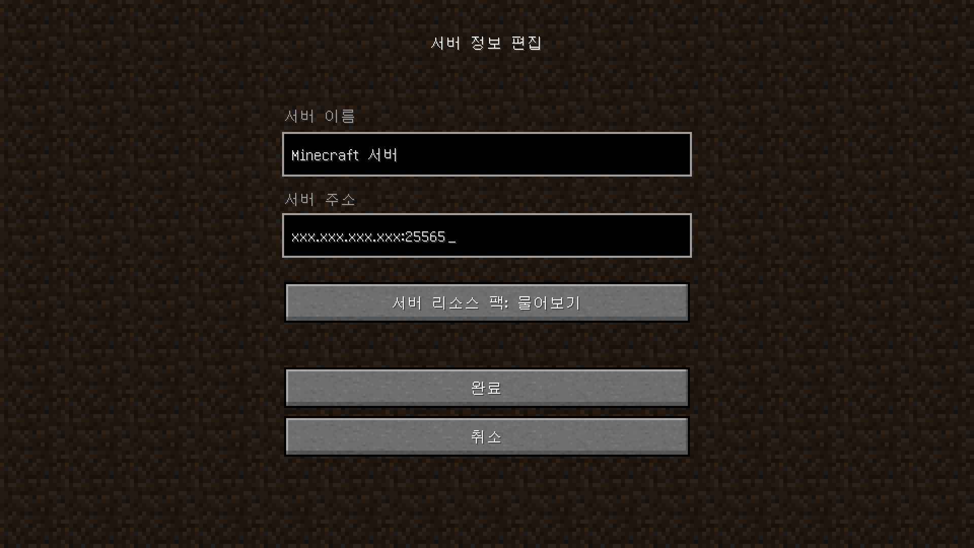 서버 이름을 설정하고 서버 주소를 설정해 줍시다. xxx가 있는 부분은 본인의 ip이고 :뒤의 25565는 아까 보셨던 서버의 접속 포트입니다.