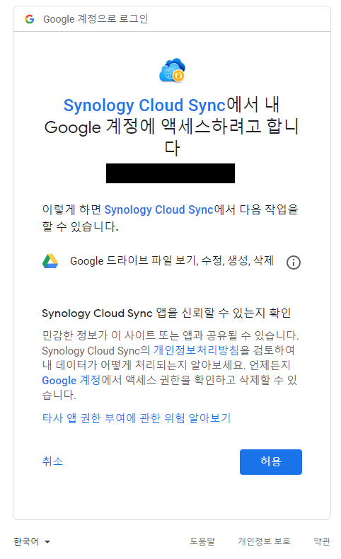 연동할 계정을 선택하면 Synology Cloud Sync에서 Google 계정에 접근 권한을 요청합니다.