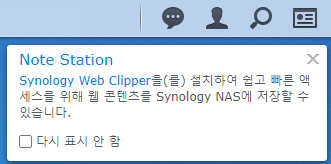 이 외에도 크롬에서 시놀로지 NAS의 DSM에서 시놀로지 Note Station을 실행시키면 오른쪽 상단에 Synology Web Clipper를 설치하라고 메시지가 나타납니다.