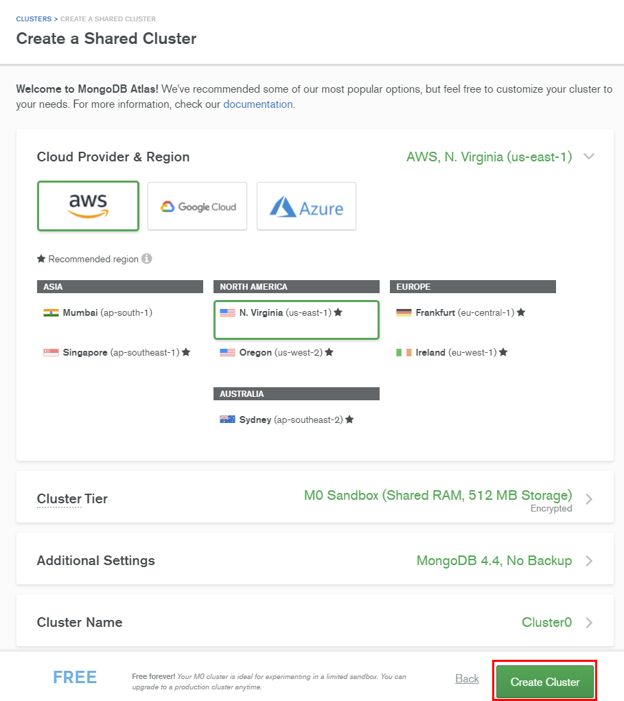 무료를 선택했기 때문에 사용을 원하는 클라우드 서비스와 클러스터 이름 정도만 설정이 가능합니다.