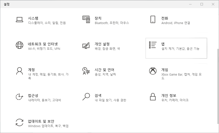 다양한 메뉴가 보입니다. 여기서 우리에게 필요한 항목은 앱입니다. 앱 항목의 아래에 보시면 설치 제거, 기본값, 옵션 가능이라고 되어 있습니다.