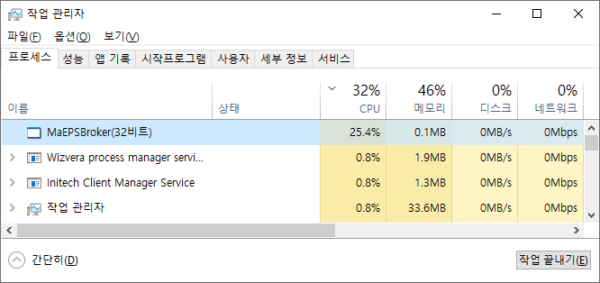 우연히 작업 관리자에서 MaEPSBroker라는 프로그램이 CPU 점유율을 25 - 35%까지 차지하고 있는 게 보였습니다.