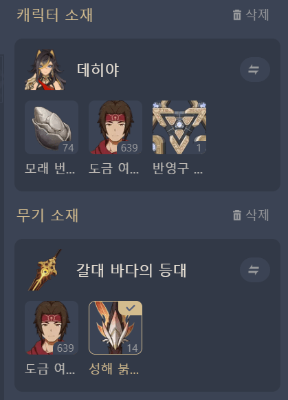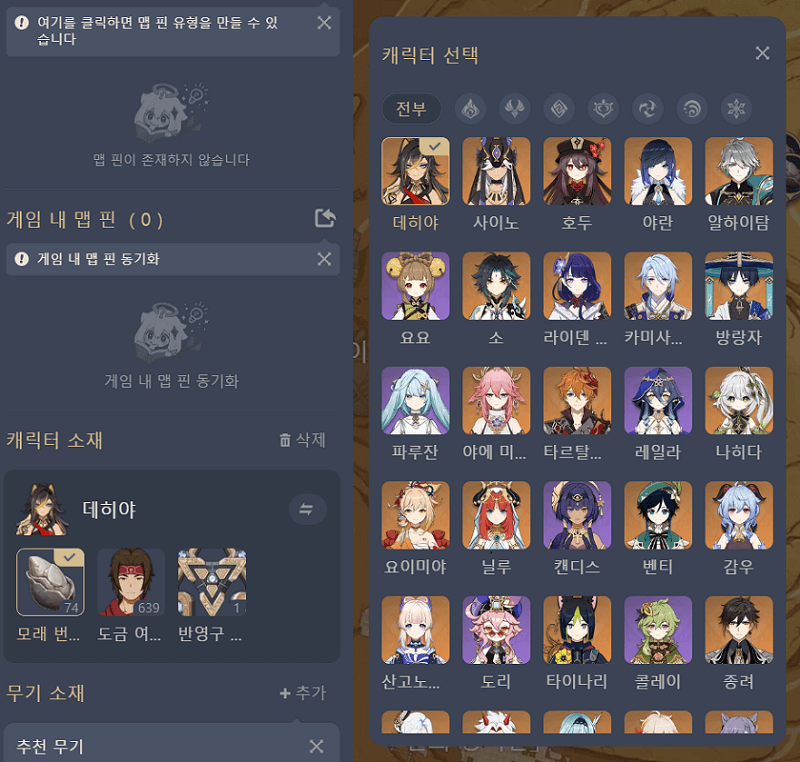언제 바뀐 건진 모르겠지만 캐릭터 육성 소재를 원하는 캐릭터 별로 선택해서 찾을 수 있게 되어 있었어요.
