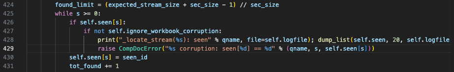 저는 Users/iteastory/dev/ChatGPT/.venv/lib/python3.11/site-packages/xlrd/compdoc.py입니다. 이 파일의 429로 가보면 아래와 같은 코드를 볼 수 있습니다. 이 부분을 수정해 줍니다.